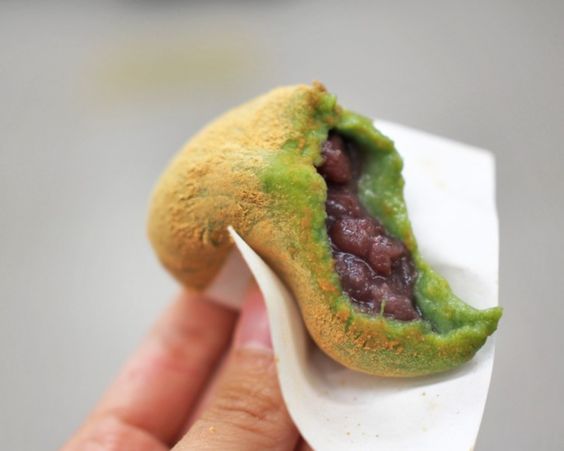 Aksi mochitsuki yang menarik ini bukan hanya untuk pertunjukan. Penumbukan yang penuh tenaga tersebut menghasilkan mochi yomogi yang lembut dan kenyal, yang kemudian ditaburi dengan kinako (tepung kedelai sangrai) sebelum disajikan. Mochi ini diisi dengan pasta kacang merah yang manis dan lengket, melengkapi rasa yomogi dengan baik, menciptakan penganan manis tradisional Jepang yang lezat. Setiap mochi dijual seharga ¥130, cukup murah mengingat Anda bisa menyaksikan proses pembuatannya dan menikmati rasanya yang enak.